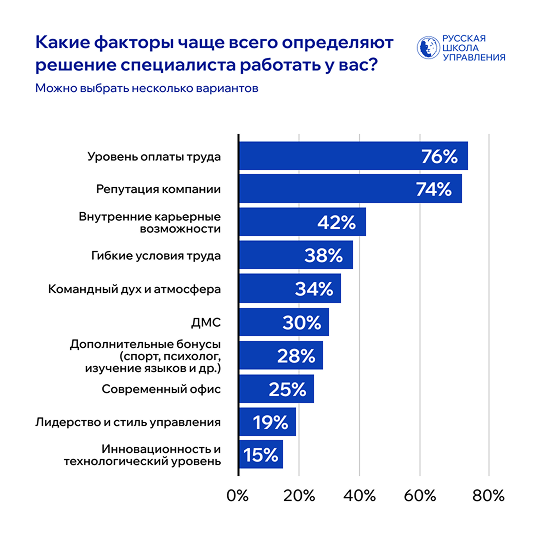 Основной вывод исследования: сейчас уже недостаточно просто предлагать высокую зарплату. Хотя 76% сотрудников по-прежнему называют уровень оплаты труда ключевым фактором при выборе работы, почти столько же (74%) обращают внимание на репутацию компании-работодателя.